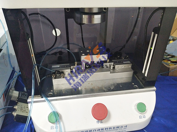 1. 本次需要进行多个蓝牙耳机同时检测,因此我们需要为蓝牙耳机定制一个特殊的模具,模具上方有两个可放置蓝牙耳机的凹槽,上方有两个专门用来固定耳机透气口的器具,检测时蓝牙耳机出气口与上方器具贴合,可以直接往蓝牙耳机内部注入气体;