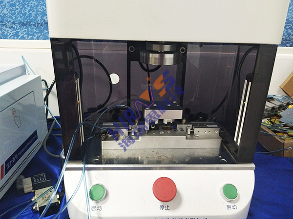 3. 放置好蓝牙耳机之后,摁下启动键,上方的器具通过导管与仪器连接,导管通过器具往耳机内部充入气体,当气体达到10.5KPA之后自动切断供给,仪器会通过内部的气压变化来判断蓝牙耳机是否达到防水标准;