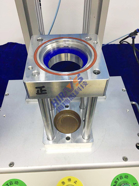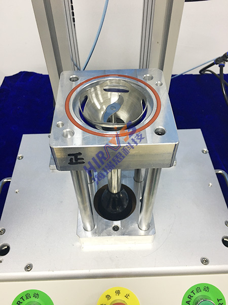 1. 针对搅拌机旋转刀头的外形,海瑞思为其定制了专门的模具(如下图),该模具上下方有专门卡位对其进行固定,上方是专门托住刀头碗状的器具,该器具在检测时由于模具的外形是处于固定状态的,在检测时,工装上模具会对刀头的碗状器具进行封闭,形成密闭的空间;