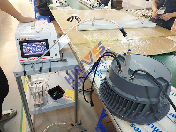 2. 将通道灯与我们的仪器连接之后,仪器内部有一个阀岛、储气罐等部件及我们设定好的程序,通过连接后,在检测灯的时候,按下启动键。此时,上下模具开始闭合,往灯具内部充入不含杂质的干净气体,仪器显示屏会通过模具内部的气体饱和度进行判断灯的防水性程度。
