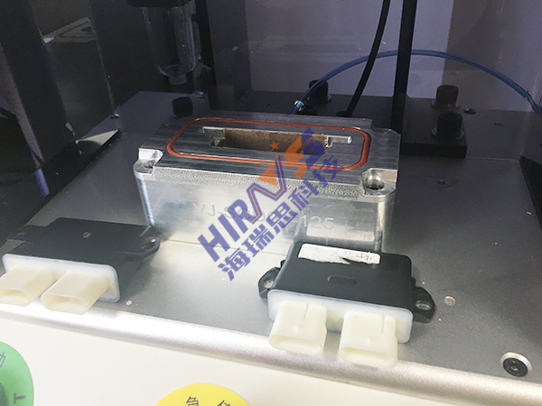 2. 将汽车ECU脚踢控制系统放入到工装模具之后,下方的模具是与仪器导管进行连接的,检测开始,我们要先设定好的程序,通过连接后,按下启动键。此时,上下模具开始闭合,仪器就会通过下方模具往汽车ECU脚踢控制系统内部充入不含杂质的干净气体,仪器显示屏会通过该ECU系统内部的气体饱和度进行判断汽车ECU脚踢控制系统的密封性程度。