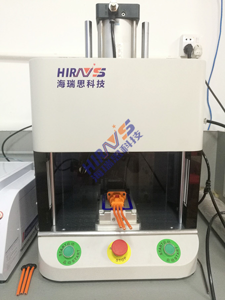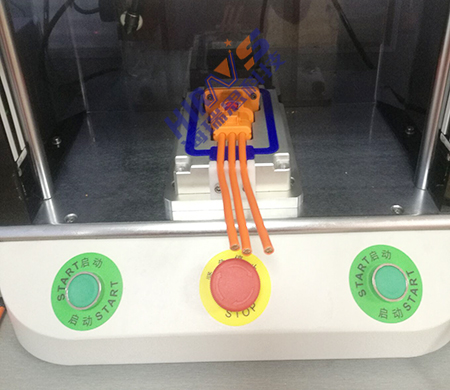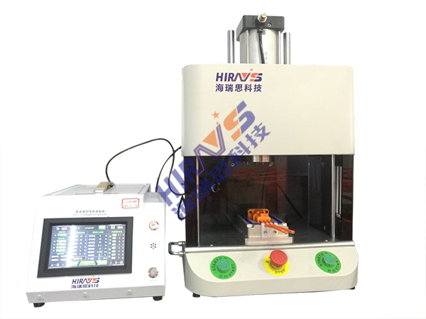 2. 将连接器放入到工装模具中,与我们的仪器连接,仪器内部有一个阀岛、储气罐等部件及我们设定好的程序,通过连接后,按下启动键。此时,上下模具开始闭合,往模具内部充入不含杂质的干净气体,仪器显示屏会通过模具内部的气体饱和度进行判断控制盒的密封程度。