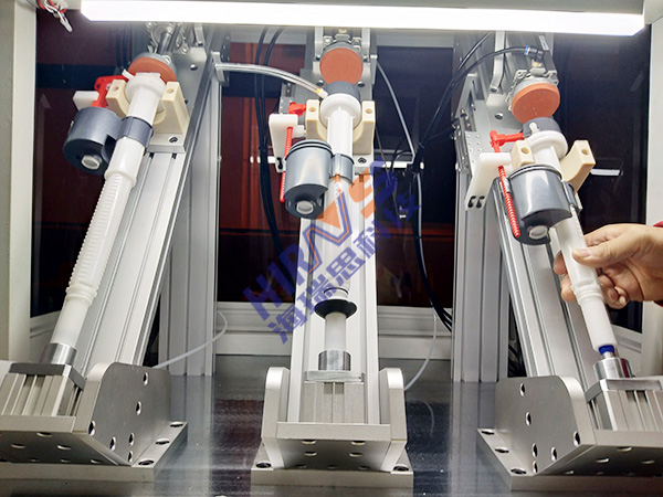 1. 首先针对马桶进水阀的外形及结构,海瑞思为其定制了专门的检测方案。由于马桶进水阀的结构为互通的,可以使用前后固定的方式往马桶进水阀内部充入气体来检测它的气密性;