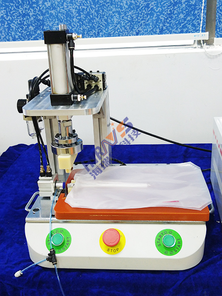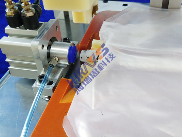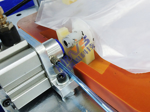 3. 连接后,按下启动键。储水袋管后的上下方模具闭合,对储水袋管口进行固定,工装左方连接导管的器具会往储水袋内部充入不含杂质的气体,这样就可以通过储水袋内部空气的饱和度来判断对储水袋的密封性情况;